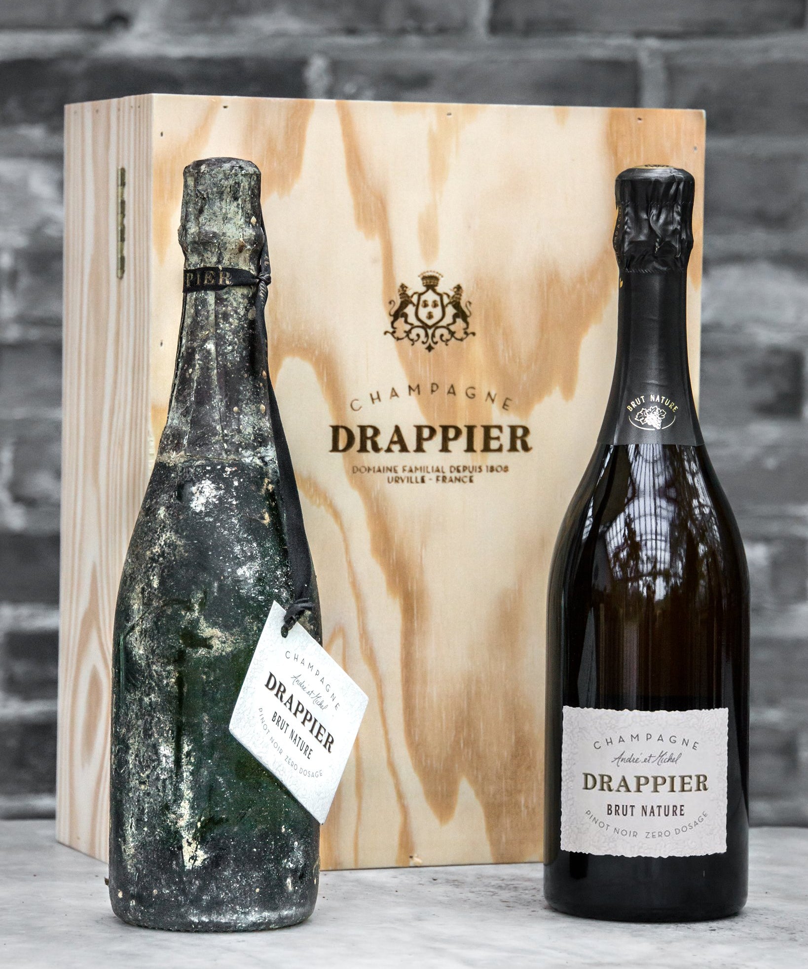 “Drappier Coffret Immersion”, “Brut Nature Champagne”, “underwater aged champagne”, “Blanc de Noirs 100 % Pinot Noir”, “Côte des Bar”, “zero dosage”.