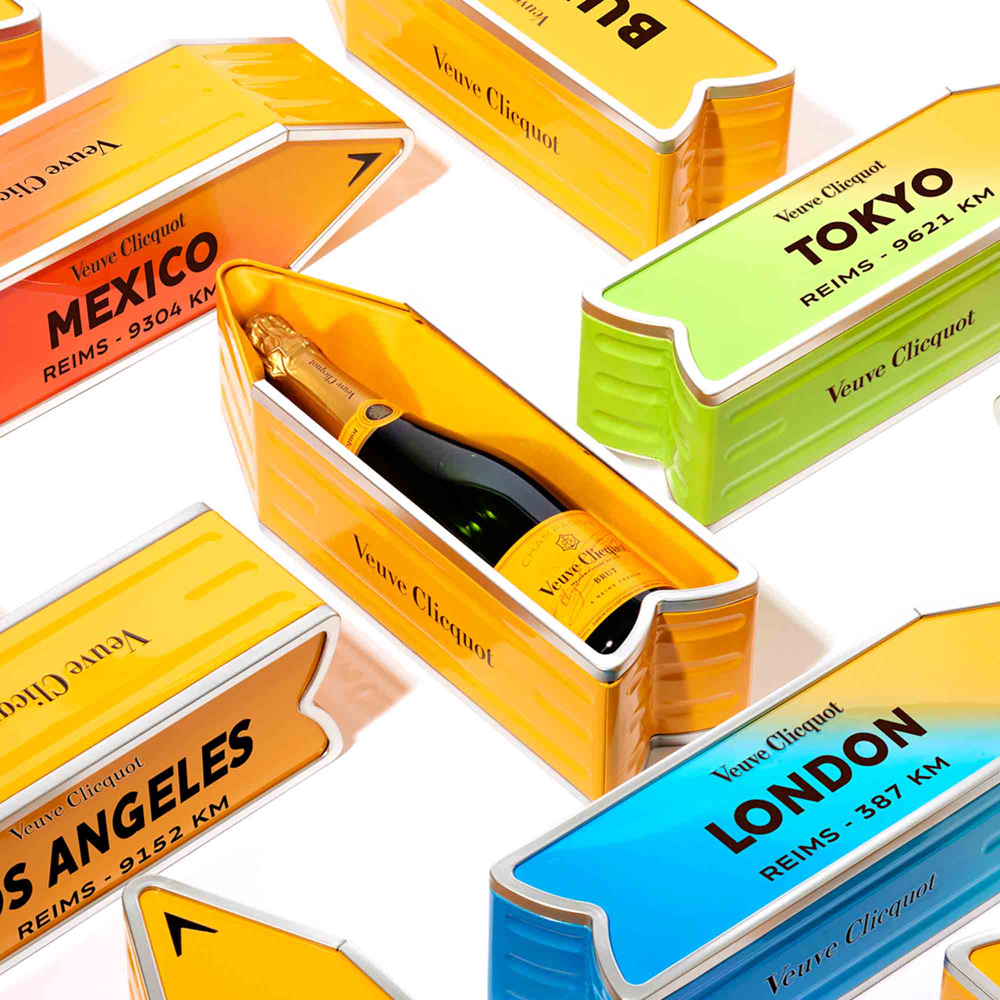 Veuve Clicquot Arrow er en flot tin kasse lavet af genbrugs tin og sukkerrørs affald, som du kan få personliggjort med din favorit placering og afstanden fra Reims - Veuve Clicquot's hjemby.
