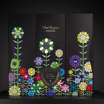 På flaskerne erstattes det traditionelle vinmarksbillede på Dom Pérignon-skjoldet af et fantasifuldt, blomstrende landskab. På æskerne indrammes skjoldet af Murakamis livlige blomster, som springer ud i en jublende overflod. Placeret side om side danner æskerne et modulært, floralt tableau, der inviterer samlere til at lege, samle og forlænge oplevelsen – langt ud over flasken.