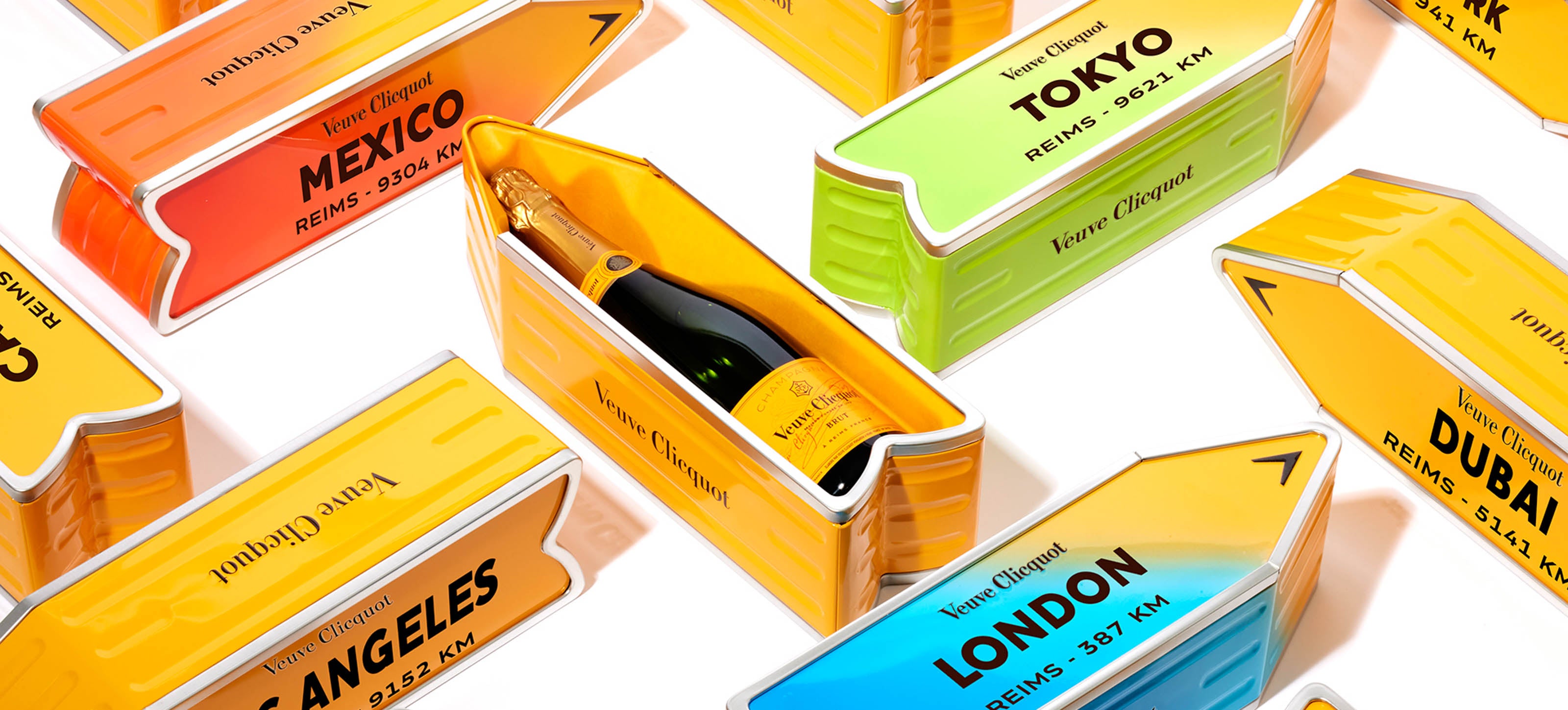 Veuve Clicquot Arrow er en flot tin kasse lavet af genbrugs tin og sukkerrørs affald, som du kan få personliggjort med din favorit placering og afstanden fra Reims - Veuve Clicquot's hjemby.